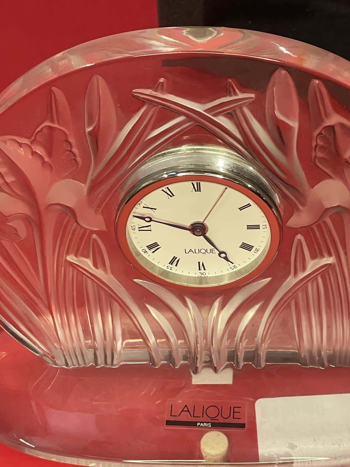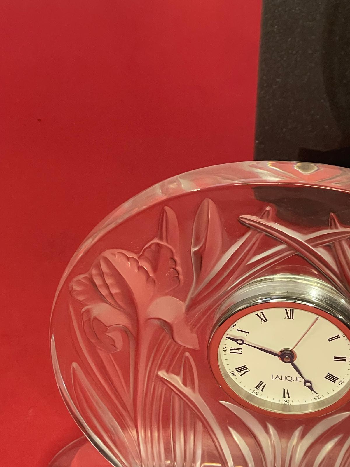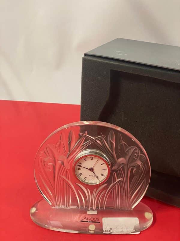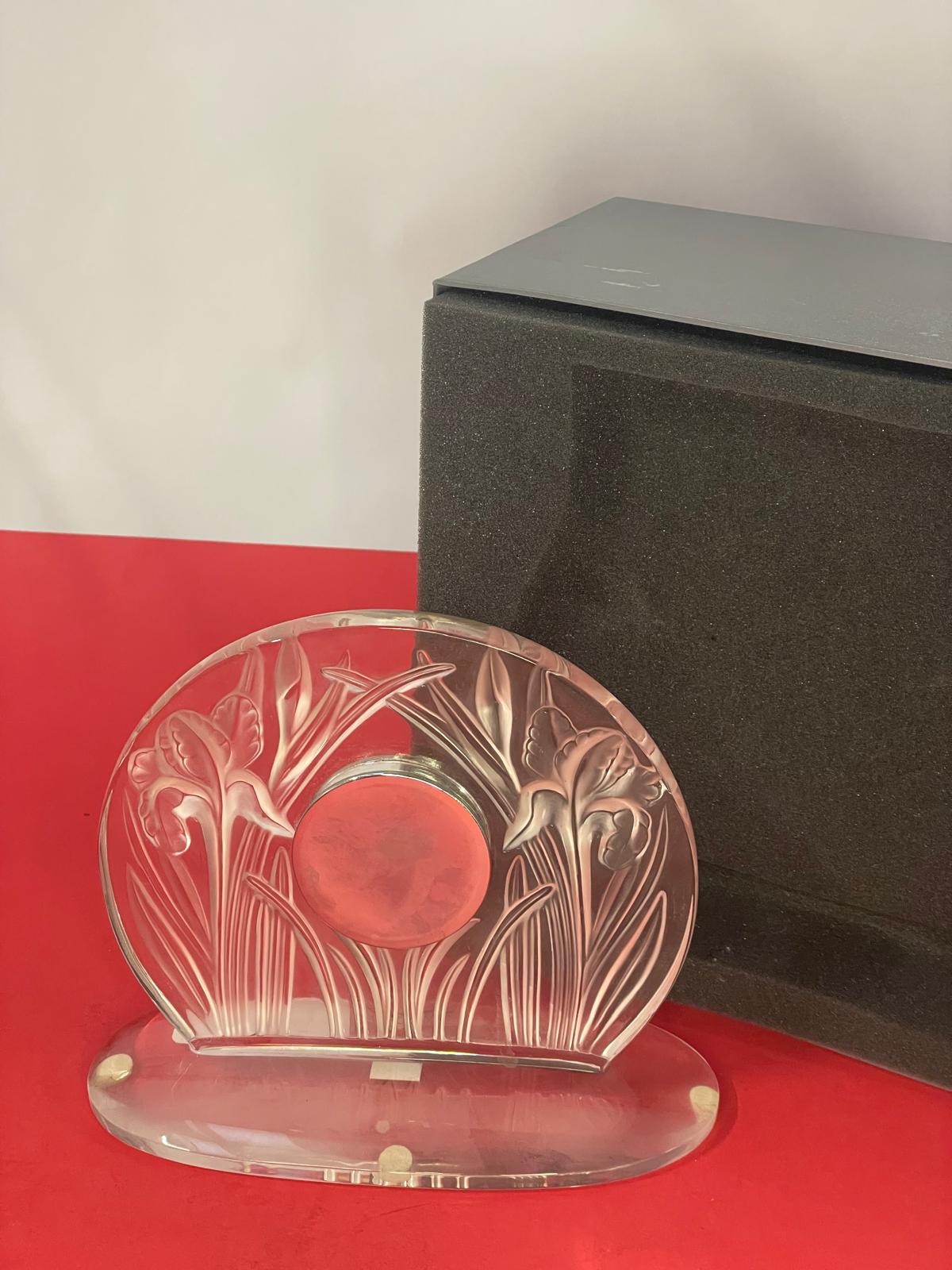 Splendid crystal table clock pendulettes by Lalique. In excellent condition, comes with its original box. Dimensions 21 x 9 height 18