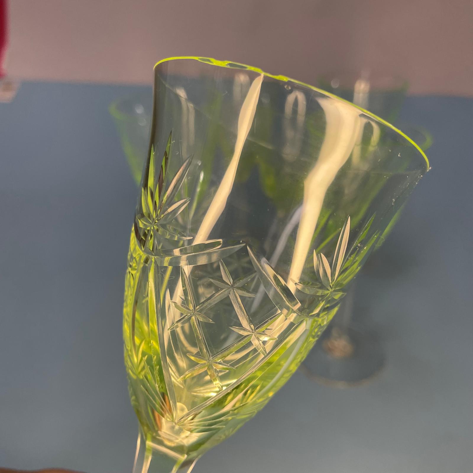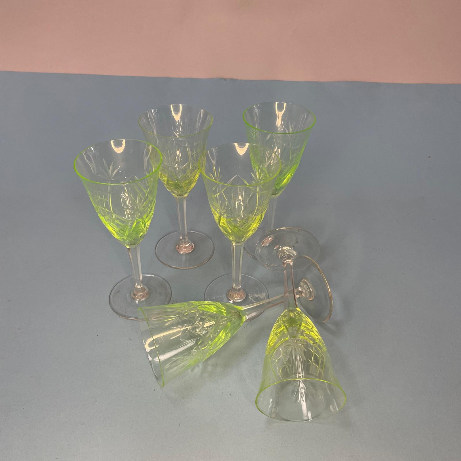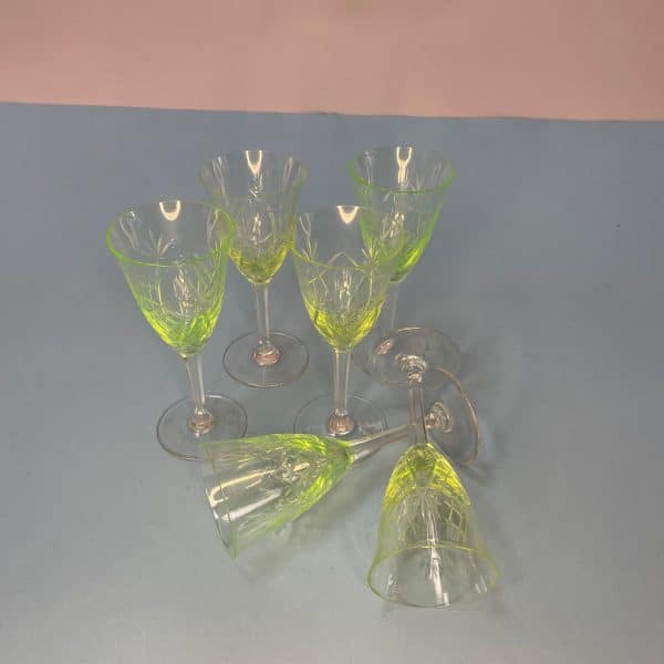 Set consisting of six vintage goblets with a glass base and a uranium-oxide glass bowl. Characterized by a light yellow-green color, they are in excellent condition.