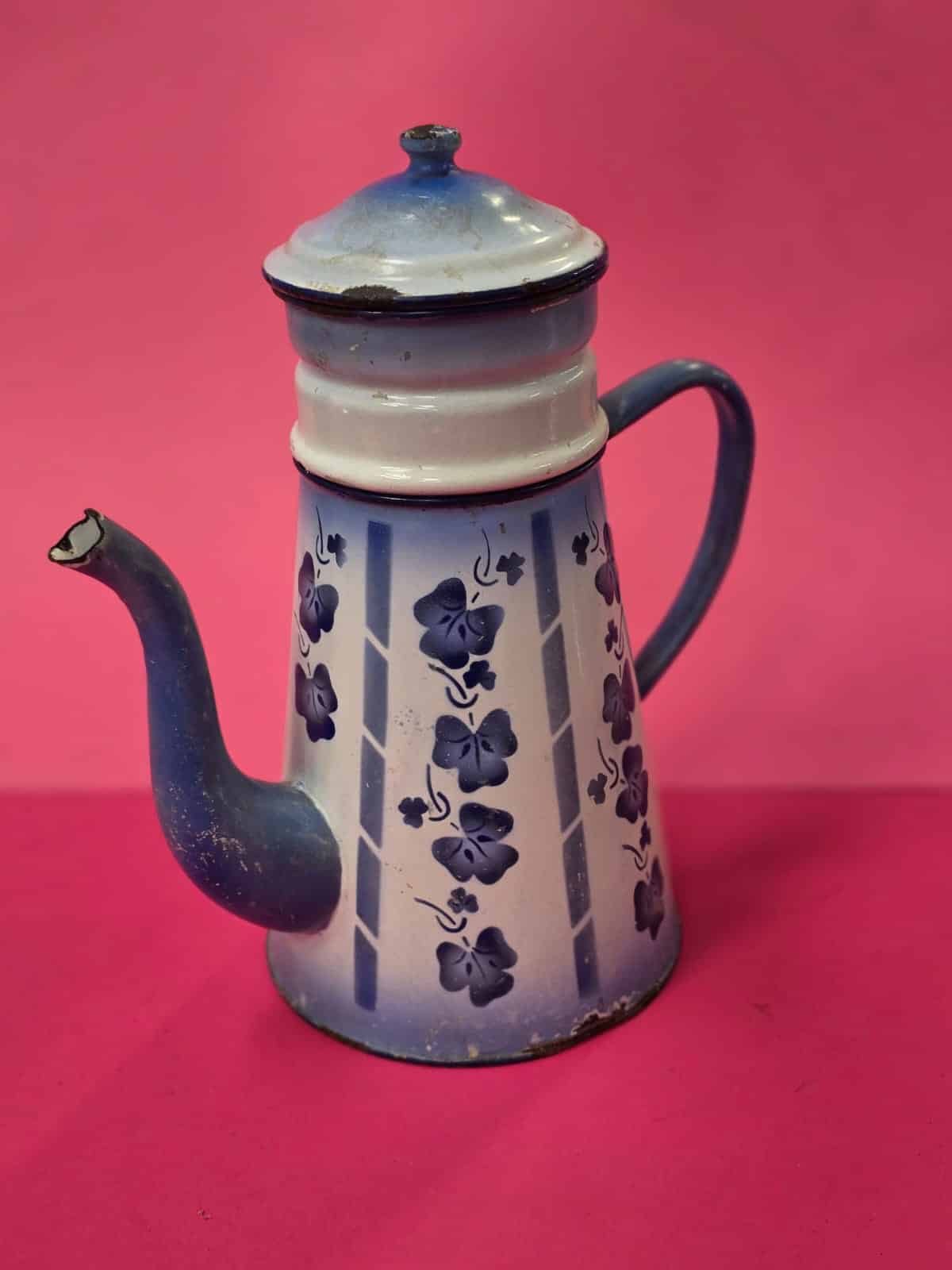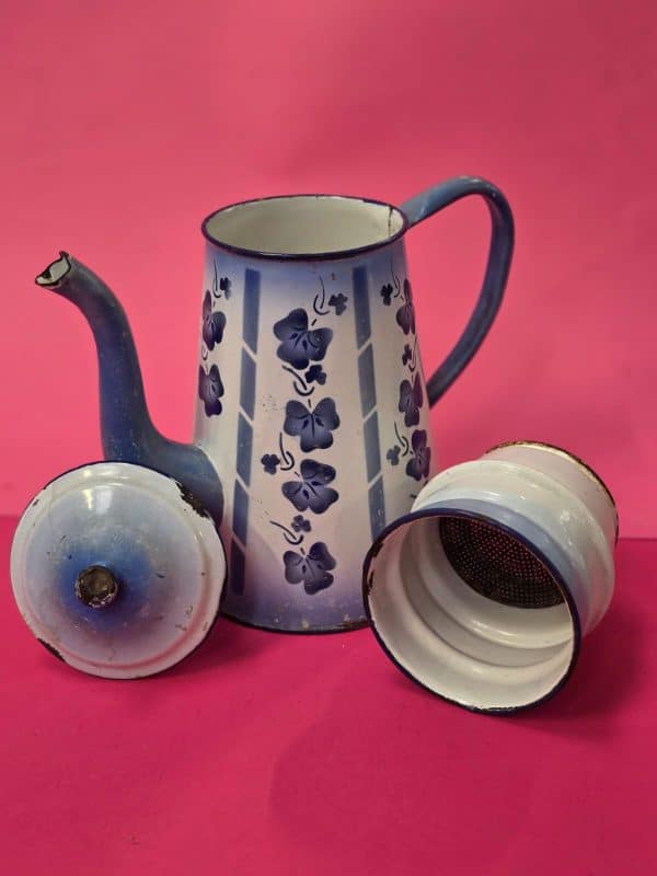 Antica caffettiera Francese con filtro in metallo smaltato con decoro floreale sui toni del blu. In buone condizioni, dimensioni diametro basa 16 altezza 33