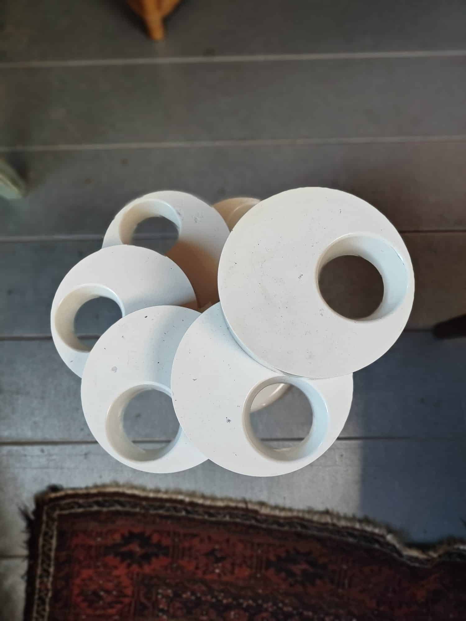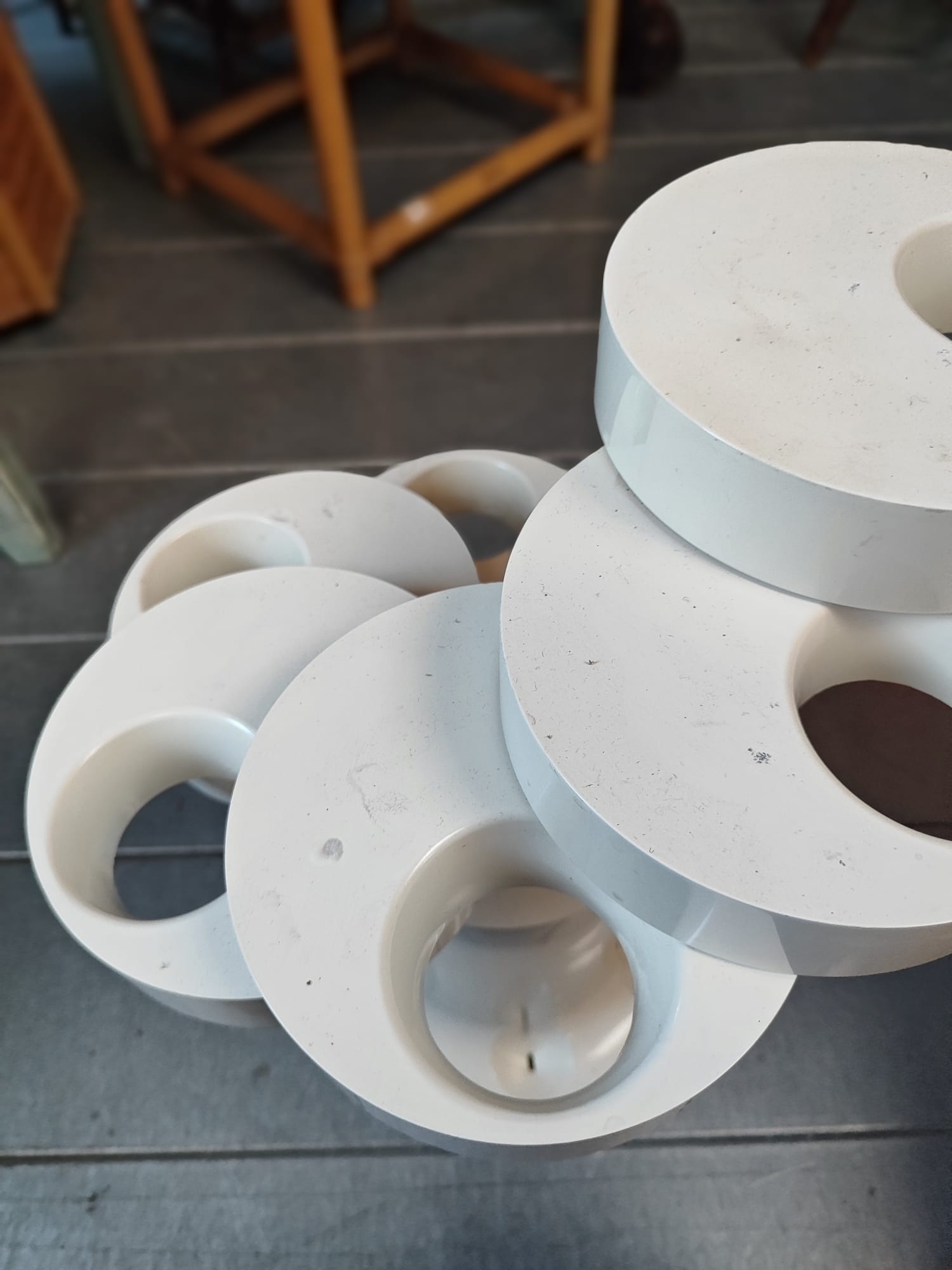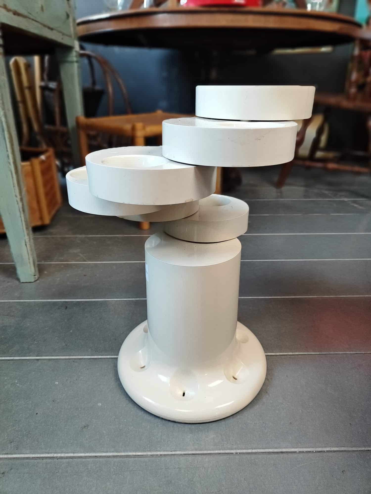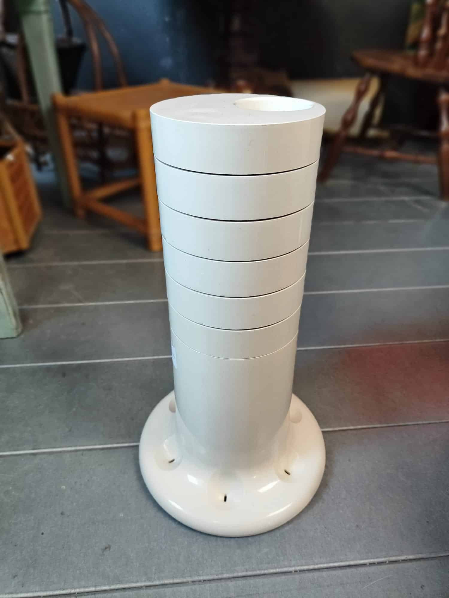 Realizzato in plastica bianca, si apre a ventaglio e si richiude in un unica torretta.