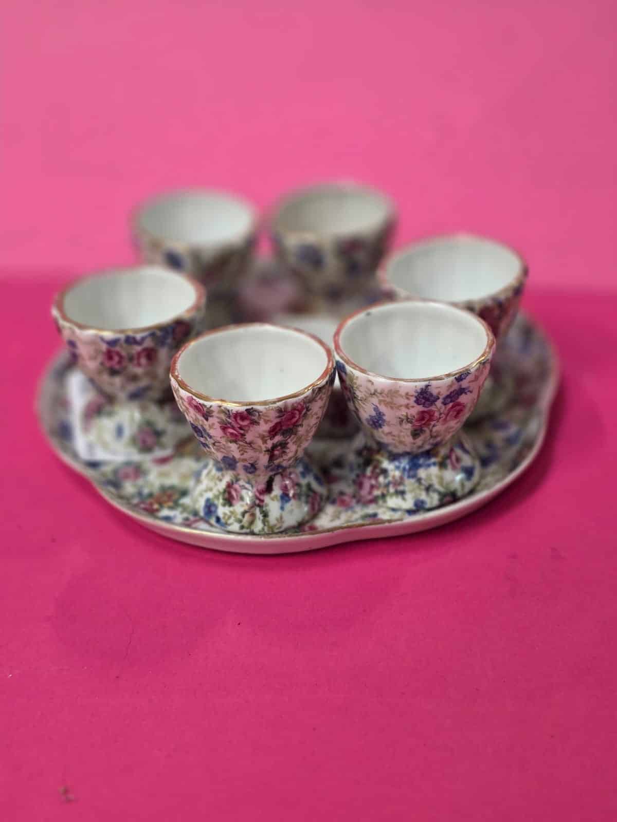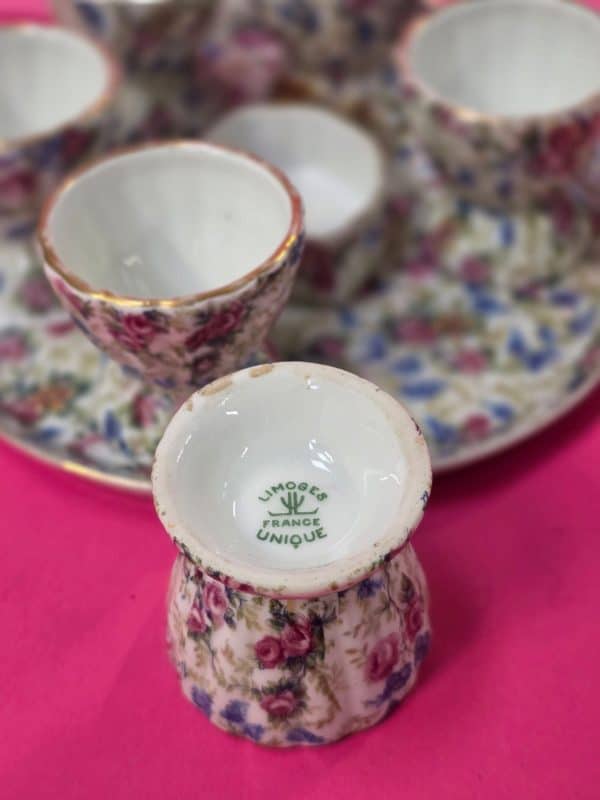 Set portauovo in ceramica Limonges composto da sei portauovo, piccola coppetta centrale e piatto di portata.