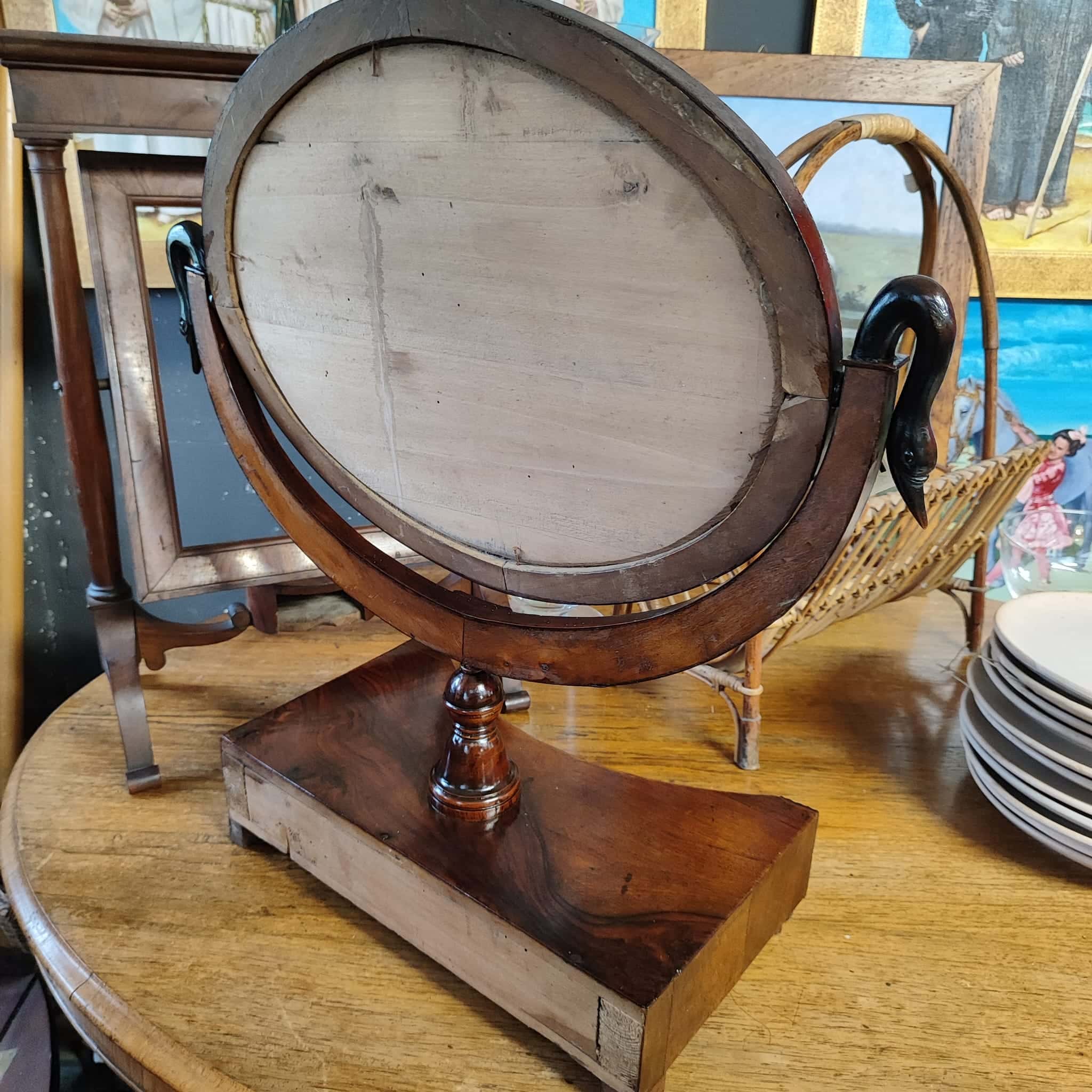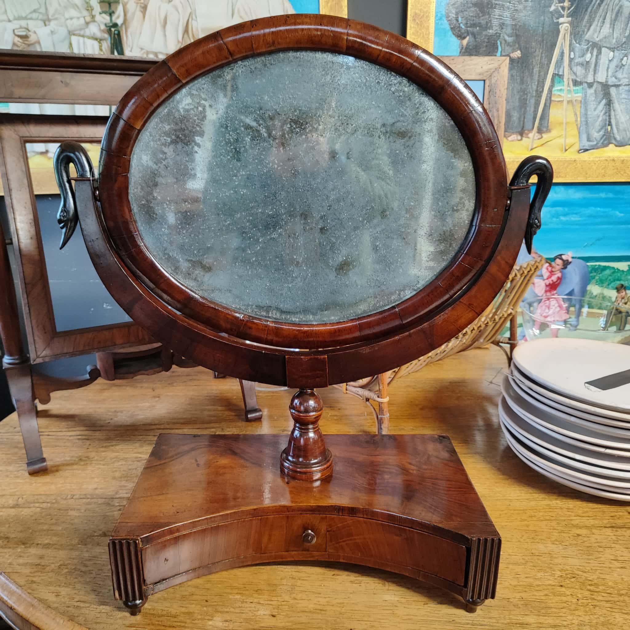 Dotata di cassettino centrale, ha forma semicircolare ed è finemente decorata con cigni laterali che sorreggono lo specchio originale.