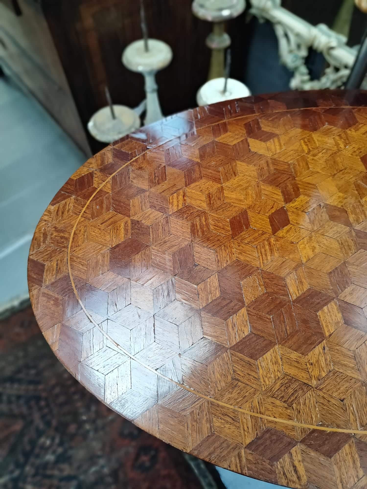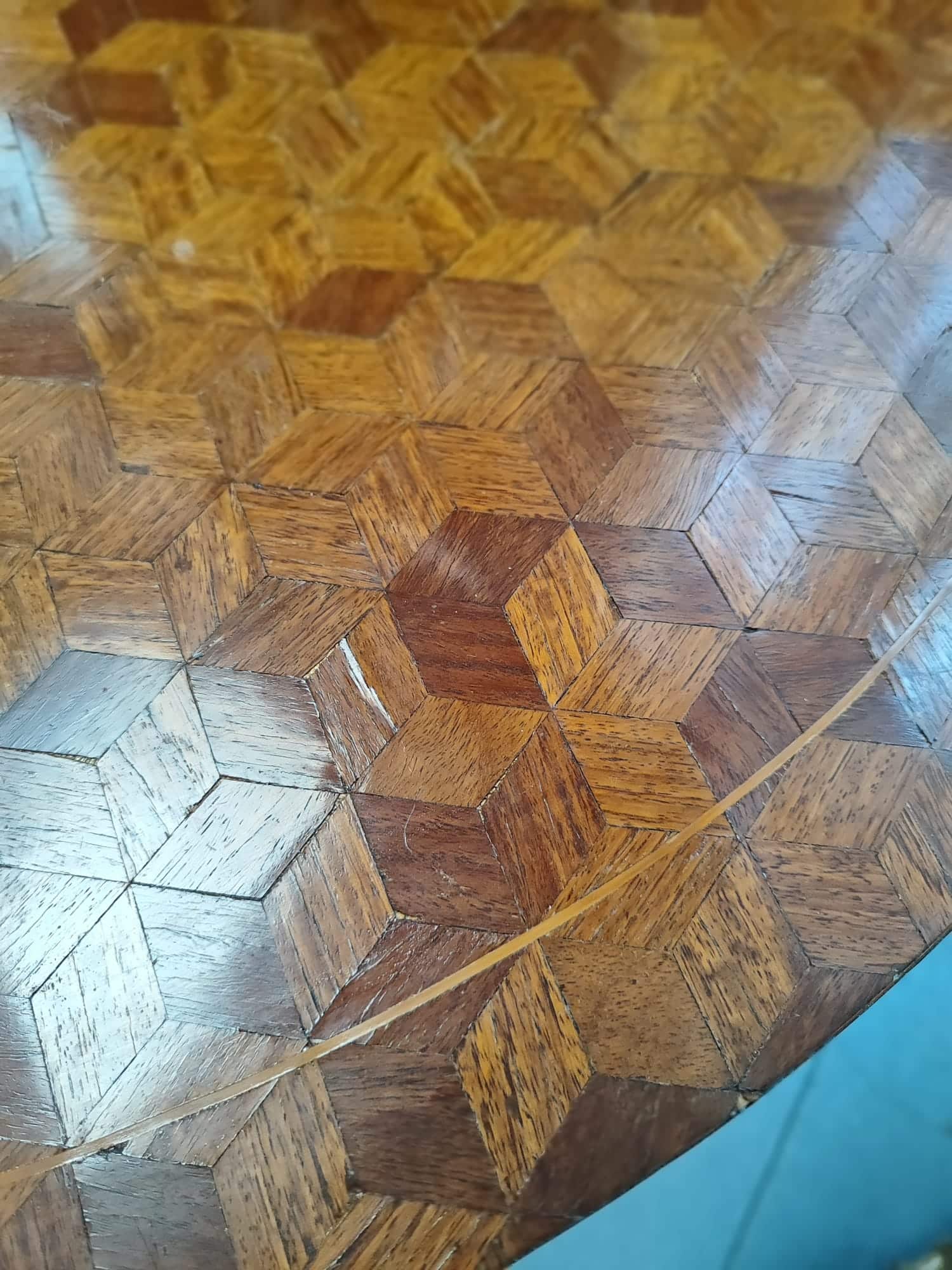 Il piano presenta un decoro a scacchiera, è dotato di un piccolo piano sottostante sorretto da montanti.