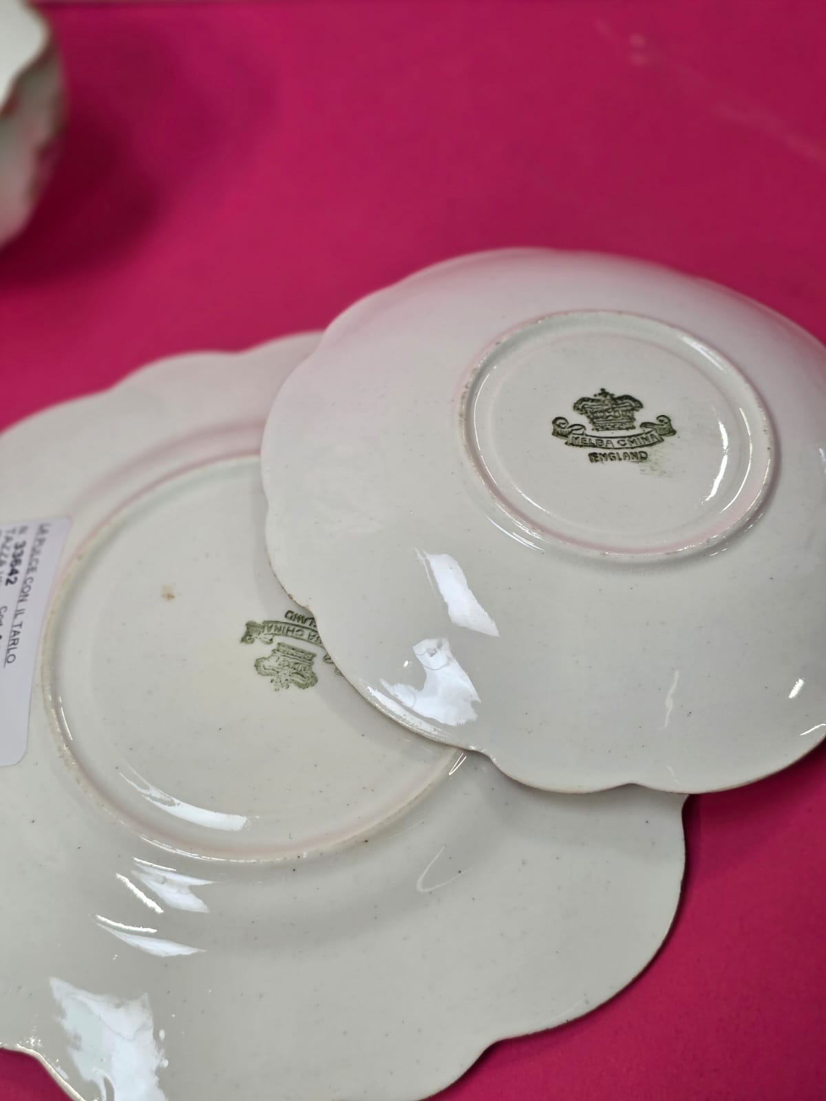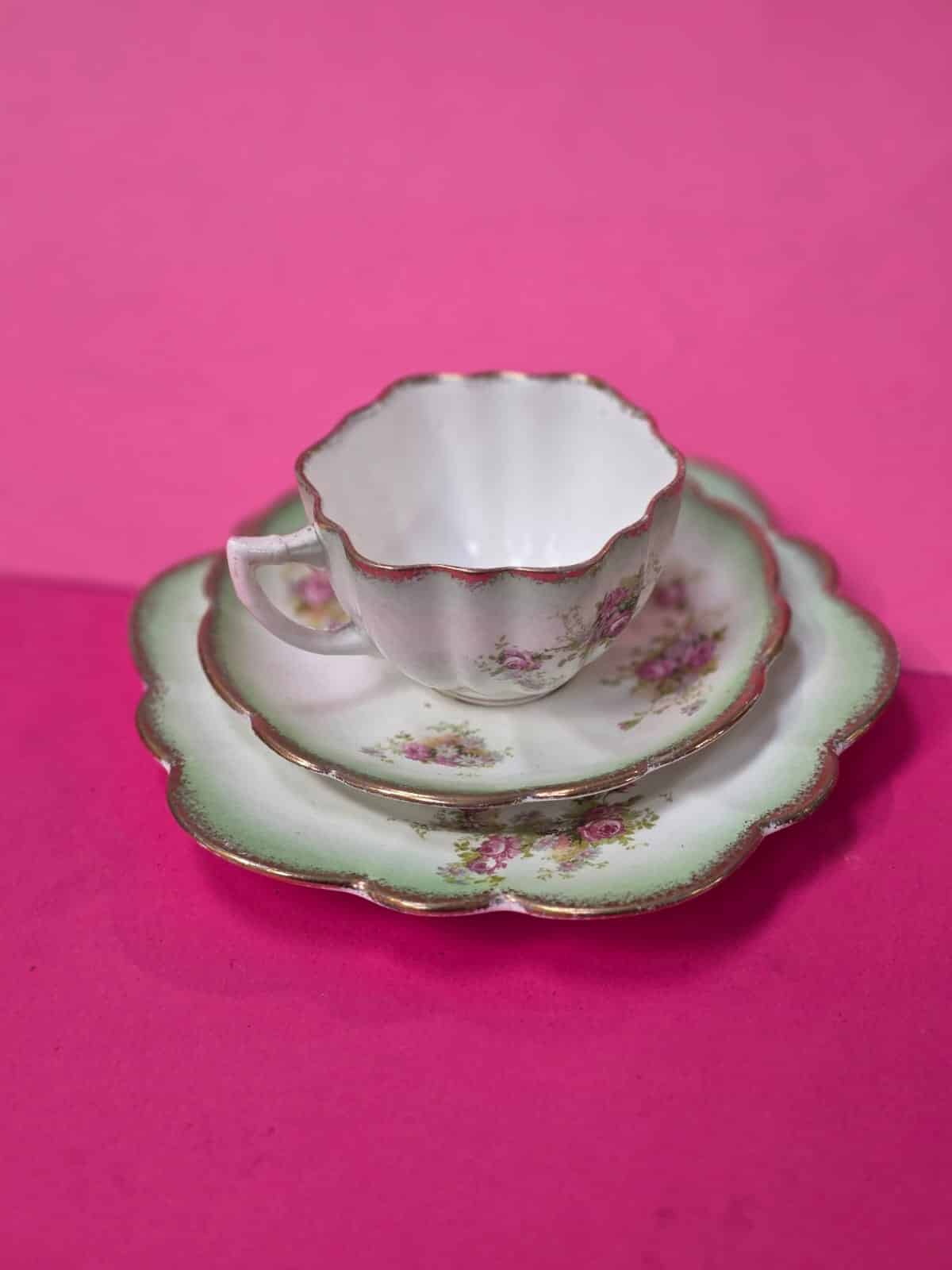 Rara tazza Melba China ceramica Inglese con doppio piattino. Sia la tazza che i piattini ricordano una corolla con decoro floreale su base verde chiaro. In buone condizioni dimensioni diametro piattini 14 e 17